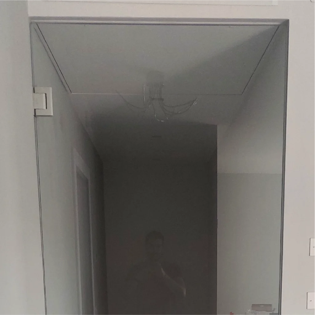 La porta è stata realizzata con vetro trasparente di sicurezza, fissata con cerniere silenziose e maniglia minimale in acciaio satinato. L’intervento ha incluso anche la sagomatura su misura per adattarsi alla pendenza del soffitto, ottenendo un risultato tecnicamente preciso e visivamente leggero.