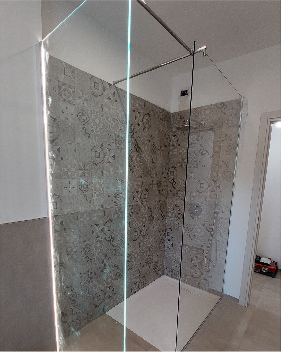A Bassano del Grappa abbiamo realizzato un box doccia angolare su misura con vetro extrachiaro e illuminazione LED integrata.